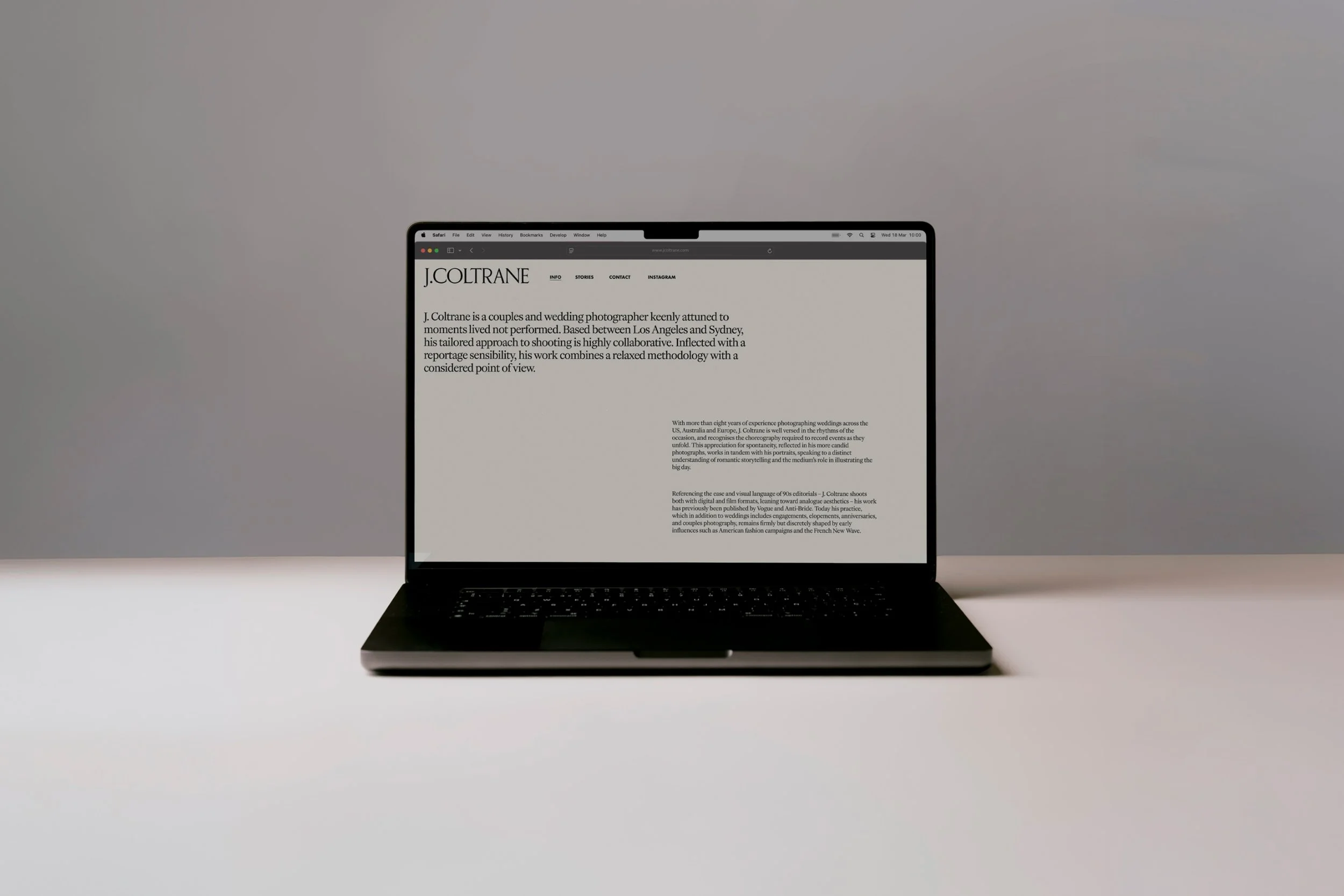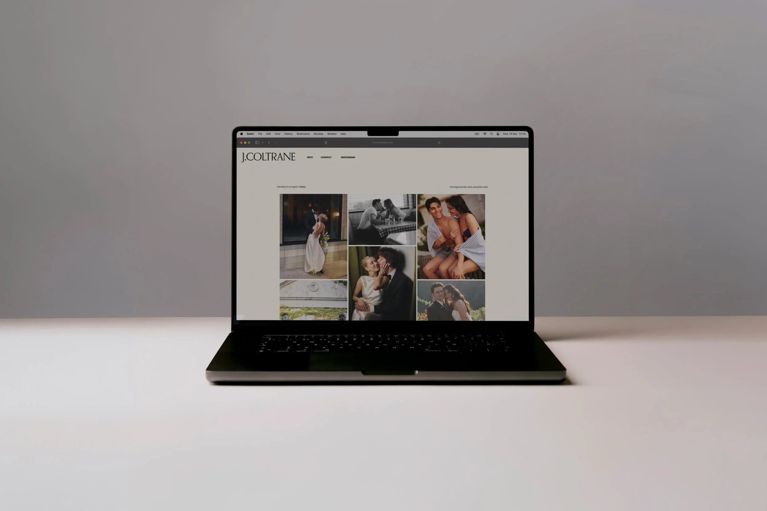 J. Coltrane is a wedding and couples photographer based between Los Angeles and Sydney. With more than eight years shooting weddings across the US, Australia and Europe, and work published by Vogue and Anti-Bride, Jack had the experience and the eye. The wedding photography industry has a look and sound – soft, safe, sentimental – and Jack's work sits nowhere near it. Our brief was to build something that told the truth about what he does.